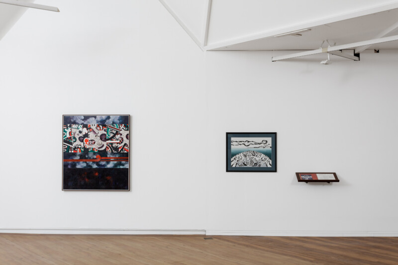 Nin was always a politically engaged artist, identifying with Whina Cooper and the hīkoi marchers in 1975, and with those involved in the Bastion Point protests that began in January 1977. It is likely that this banner painting was raised in protest at the momentous events that took place at that time. The solemn, brooding landforms and cloud shapes that lie behind the horizontal kōwhaiwhai ‘flag’ may owe something to McCahon’s structural methods and manipulation of tone.