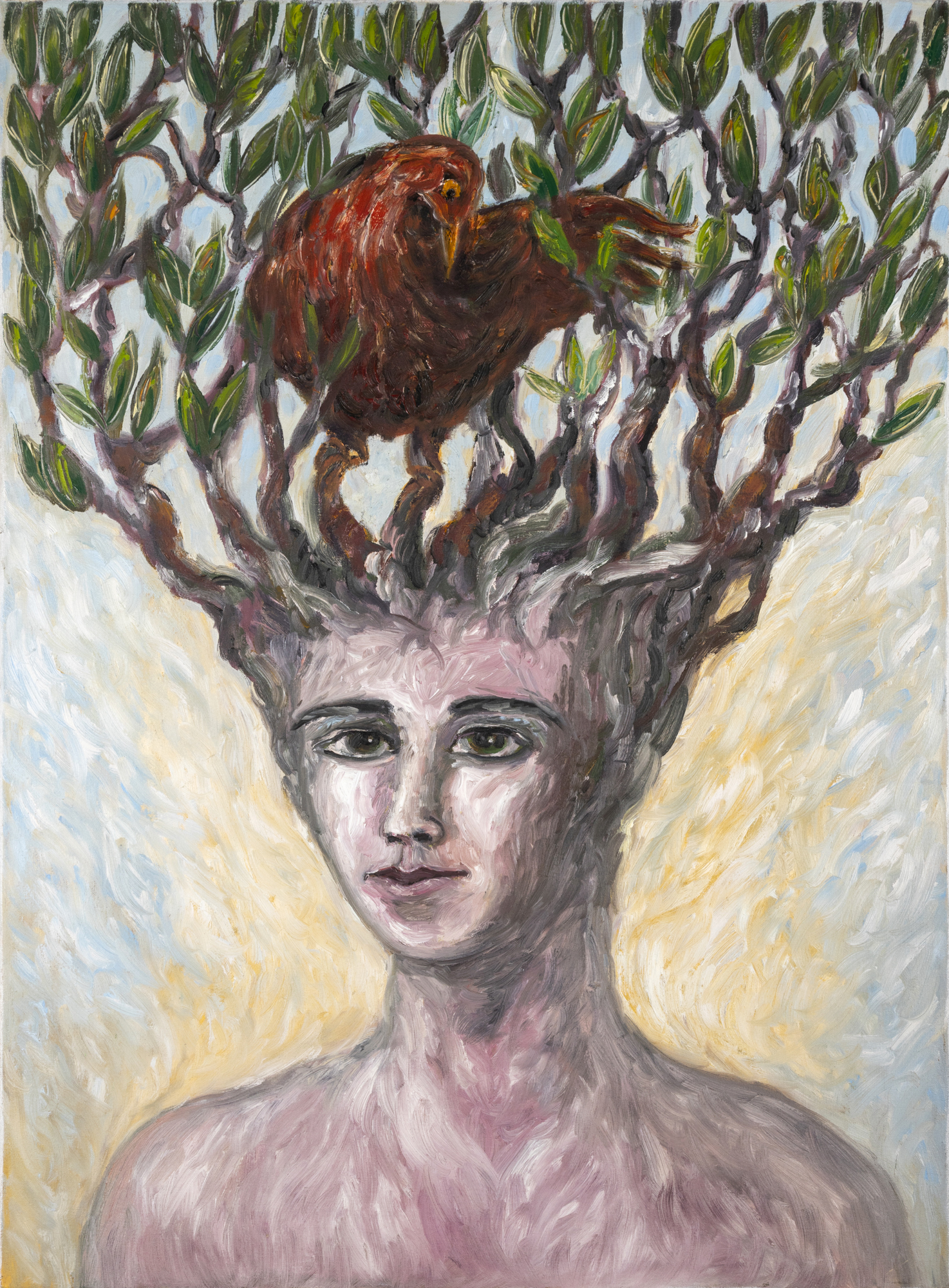 Rather than simply a mythological portrait, this painting can be read as a feminist commentary on transformation, control, and resistance. In the myth, Daphne escapes Apollo’s pursuit by turning into a laurel tree—a moment often romanticised in classical art. But here, Hunter paints her during the transformation: rooted, still human, yet no longer free. The branches grow from her head like antlers or a crown, and the bird perches within, a symbol that can be read in many different ways, perhaps suggesting watchfulness, burden, or intrusion.